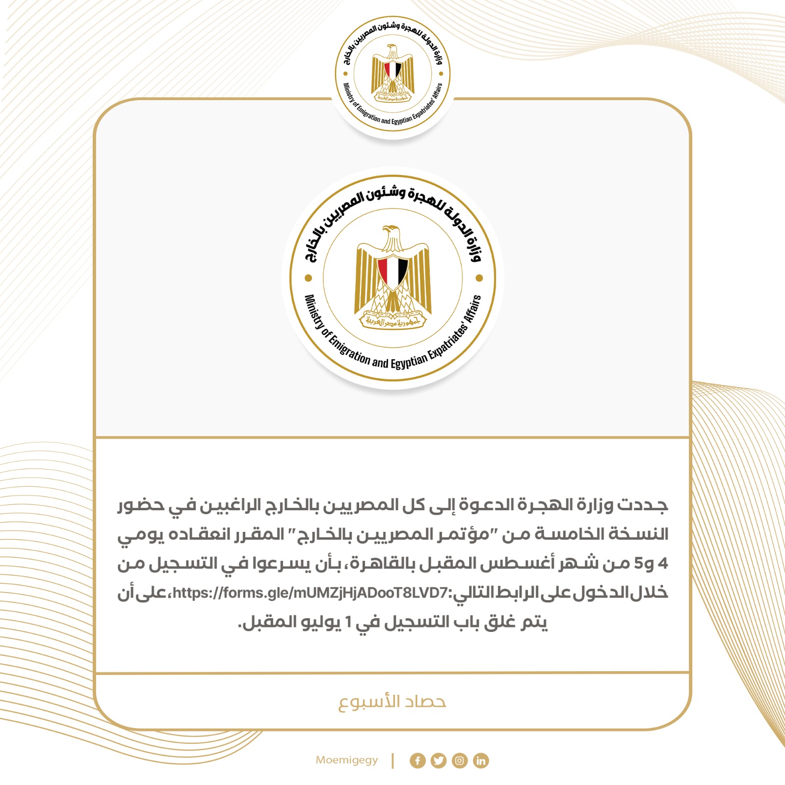 جددت وزارة الهجرة الدعوة إلى كل المصريين بالخارج الراغبين في حضور النسخة الخامسة من "مؤتمر المصريين بالخارج" المقرر انعقاده يومي 4 و5 من شهر أغسطس المقبل بالقاهرة، بأن يسرعوا في التسجيل من خلال الدخول على الرابط التالي:https://forms.gle/mUMZjHjADooT8LVD7، على أن يتم غلق باب التسجيل في 1 يوليو المقبل.