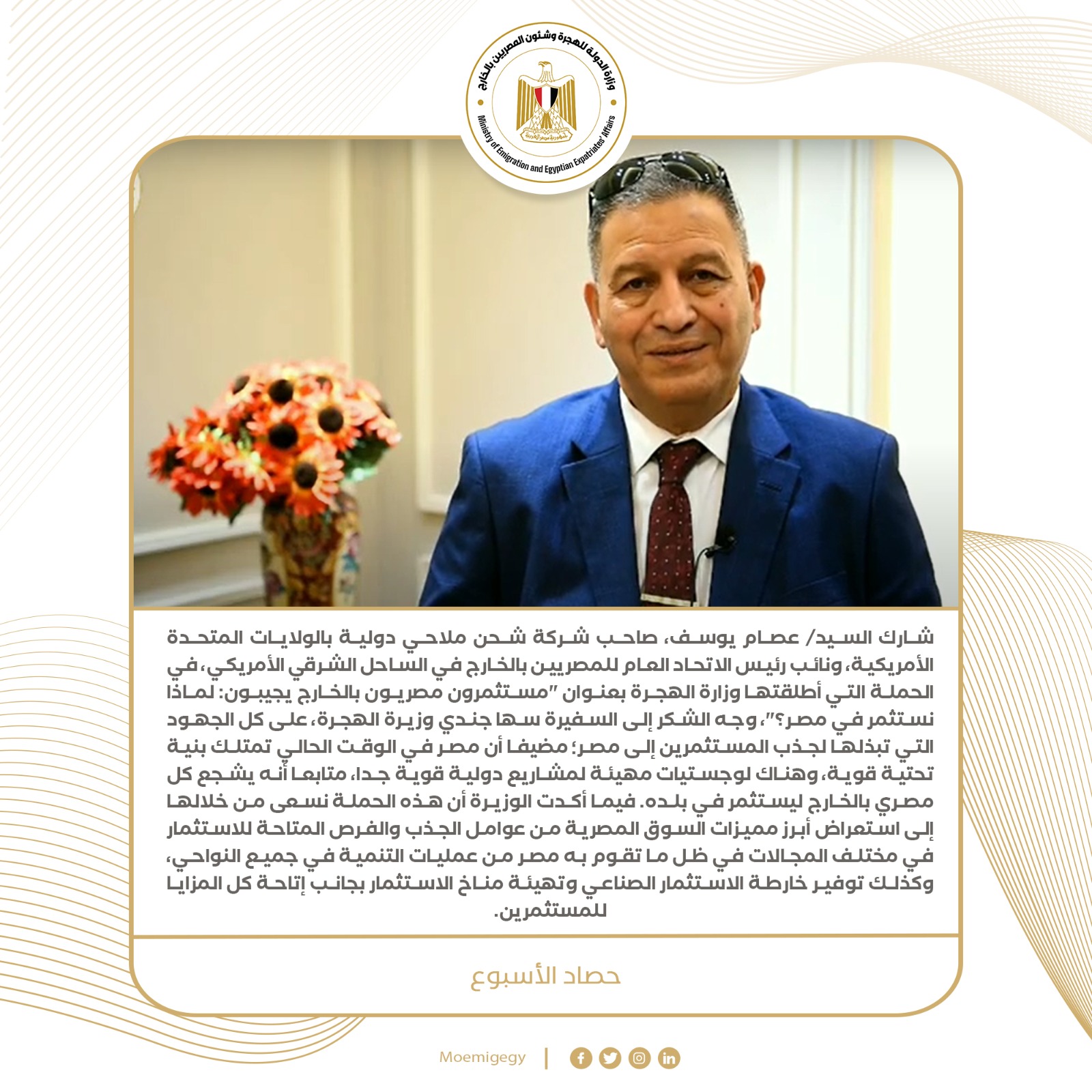 شارك عصام يوسف، صاحب شركة شحن ملاحي دولية بالولايات المتحدة الأمريكية، ونائب رئيس الاتحاد العام للمصريين بالخارج في الساحل الشرقي الأمريكي، في الحملة التي أطلقتها وزارة الهجرة بعنوان "مستثمرون مصريون بالخارج يجيبون: لماذا نستثمر في مصر؟"، وجه الشكر إلى السفيرة سها جندي وزيرة الهجرة، على كل الجهود التي تبذلها لجذب المستثمرين إلى مصر؛ مضيفا أن مصر في الوقت الحالي تمتلك بنية تحتية قوية، وهناك لوجستيات مهيئة لمشاريع دولية قوية جدا، متابعا أنه يشجع كل مصري بالخارج ليستثمر في بلده.