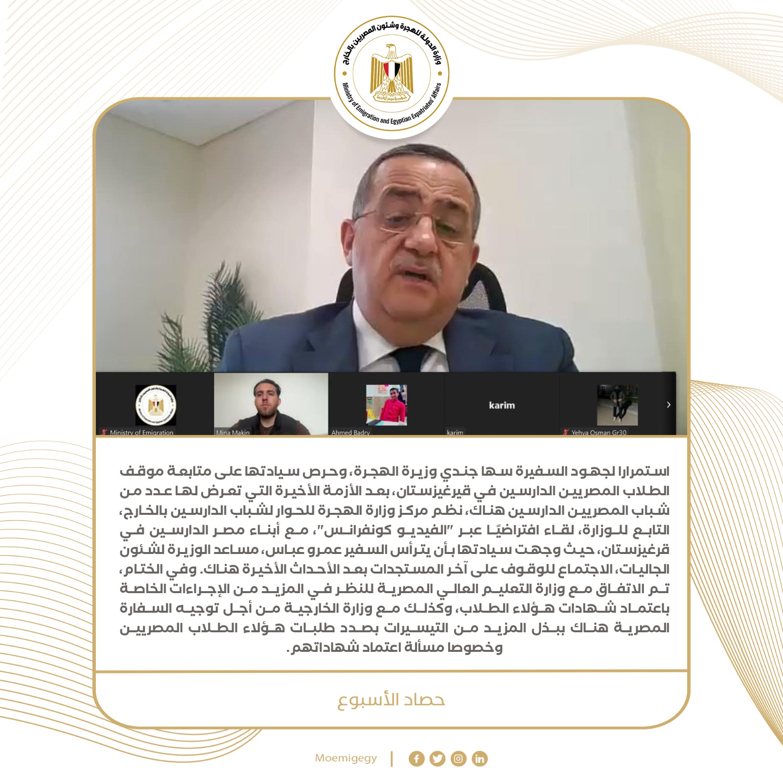 استمرارا لجهود السفيرة سها جندي وزيرة الهجرة، وحرص سيادتها على متابعة موقف الطلاب المصريين الدارسين في قيرغيزستان، بعد الأزمة الأخيرة التي تعرض لها عدد من شباب المصريين الدارسين هناك، نظم مركز وزارة الهجرة للحوار لشباب الدارسين بالخارج، التابع للوزارة، لقاء افتراضيًا عبر "الفيديو كونفرانس"، مع أبناء مصر الدارسين في قرغيزستان، حيث وجهت بأن يترأس السفير عمرو عباس، مساعد الوزيرة لشئون الجاليات، الاجتماع للوقوف على آخر المستجدات بعد الأحداث الأخيرة هناك.