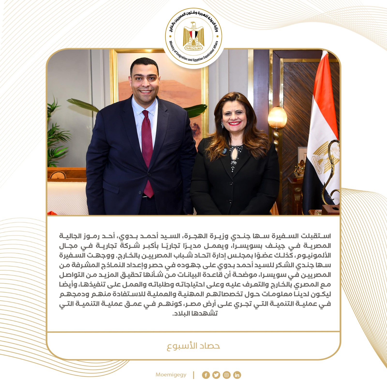 استقبلت السفيرة سها جندي وزيرة الهجرة، أحمد بدوي، أحد رموز الجالية المصرية في جينف بسويسرا، ويعمل مديرًا تجاريًا بأكبر شركة تجارية في مجال الألمونيوم، كذلك عضوًا بمجلس إدارة اتحاد شباب المصريين بالخارج.