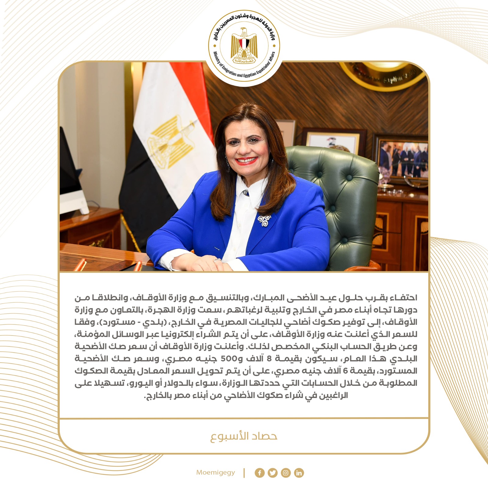 احتفاء بقرب حلول عيد الأضحى المبارك، وبالتنسيق مع وزارة الأوقاف، وانطلاقا من دورها تجاه أبناء مصر في الخارج وتلبية لرغباتهم، سعت وزارة الهجرة، بالتعاون مع وزارة الأوقاف، إلى توفير صكوك أضاحي للجاليات المصرية في الخارج، (بلدي - مستورد)، وفقا للسعر الذي أعلنت عنه وزارة الأوقاف، على أن يتم الشراء إلكترونيا عبر الوسائل المؤمنة، وعن طريق الحساب البنكي المخصص لذلك.