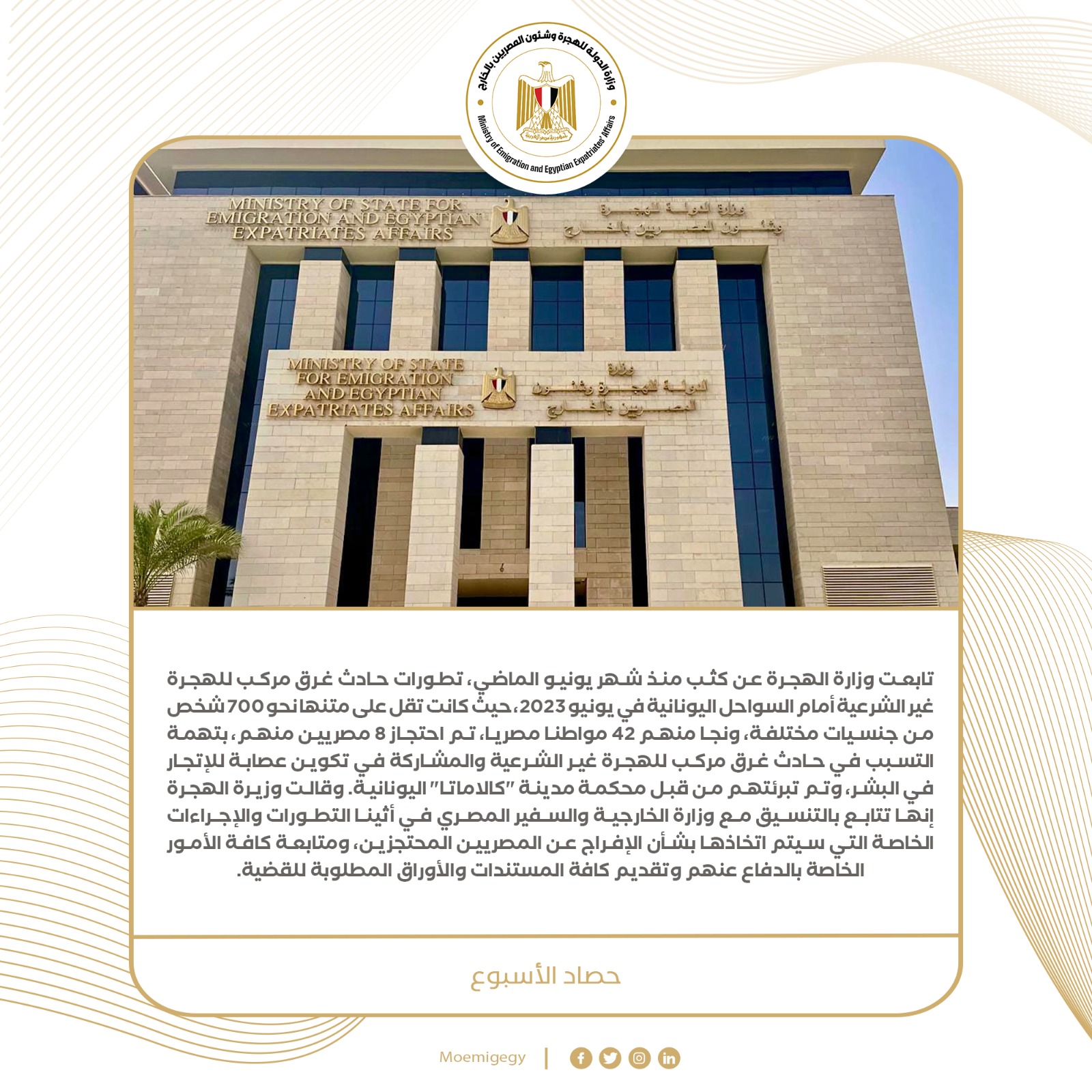 تابعت وزارة الهجرة عن كثب منذ شهر يونيو الماضي، تطورات حادث غرق مركب للهجرة غير الشرعية أمام السواحل اليونانية في يونيو 2023، حيث كانت تقل على متنها نحو 700 شخص من جنسيات مختلفة، ونجا منهم 42 مواطنا مصريا، تم احتجاز 8 مصريين منهم، بتهمة التسبب في حادث غرق مركب للهجرة غير الشرعية والمشاركة في تكوين عصابة للإتجار في البشر، وتم تبرئتهم من قبل محكمة مدينة "كالاماتا" اليونانية.