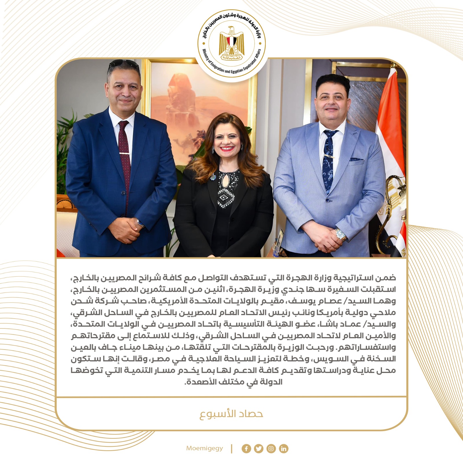 ضمن استراتيجية وزارة الهجرة التي تستهدف التواصل مع كافة شرائح المصريين بالخارج، استقبلت السفيرة سها جندي وزيرة الهجرة، اثنين من المستثمرين المصريين بالخارج، وهما عصام يوسف، مقيم بالولايات المتحدة الأمريكية، صاحب شركة شحن ملاحي دولية بأمريكا ونائب رئيس الاتحاد العام للمصريين بالخارج في الساحل الشرقي، عماد باشا، عضو الهيئة التأسيسية باتحاد المصريين في الولايات المتحدة، والأمين العام لاتحاد المصريين في الساحل الشرقي، وذلك للاستماع إلى مقترحاتهم واستفساراتهم.