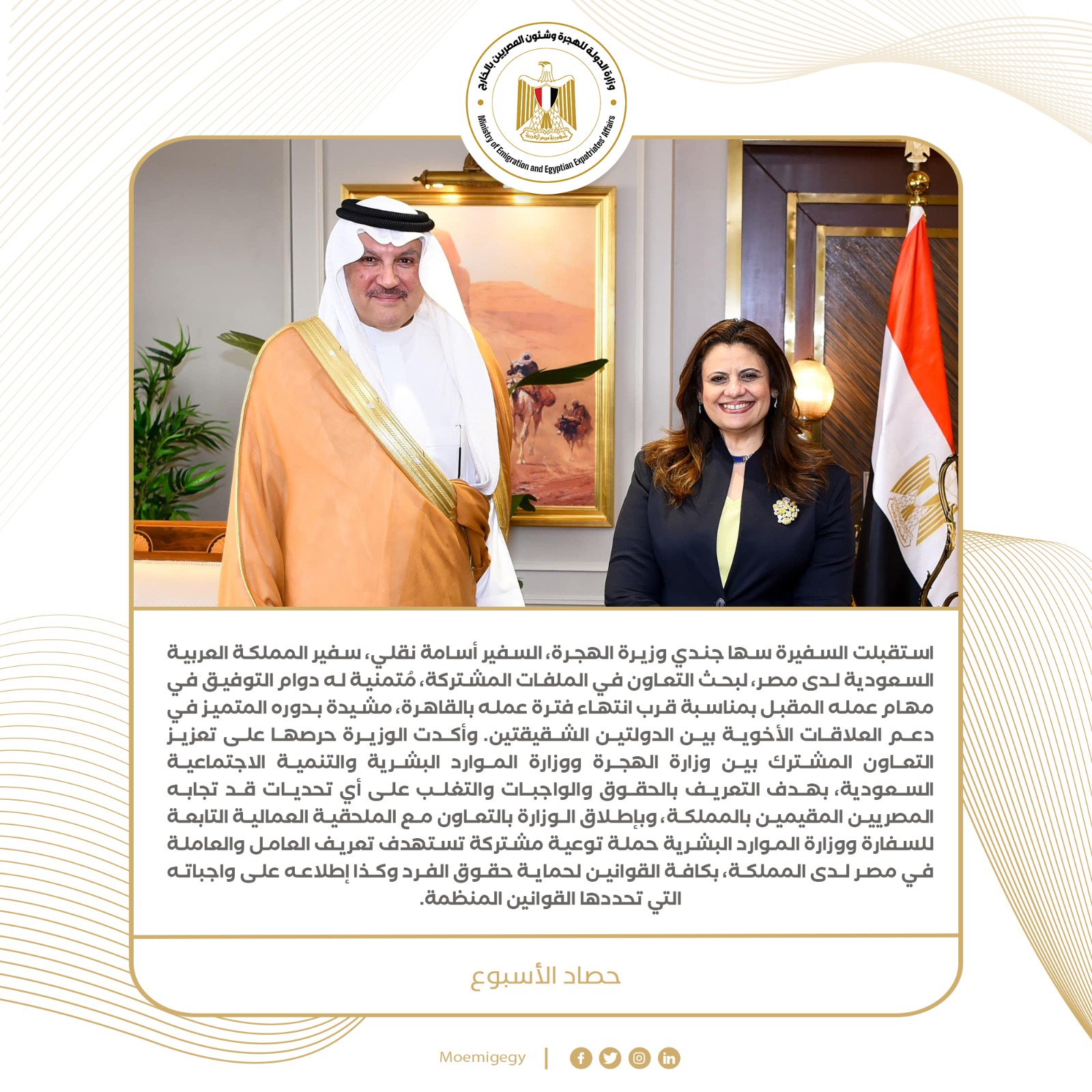 استقبلت السفيرة سها جندي وزيرة الهجرة، السفير أسامة نقلي، سفير المملكة العربية السعودية لدى مصر، لبحث التعاون في الملفات المشتركة، مُتمنية له دوام التوفيق في مهام عمله المقبل بمناسبة قرب انتهاء فترة عمله بالقاهرة، مشيدة بدوره المتميز في دعم العلاقات الأخوية بين الدولتين الشقيقتين.