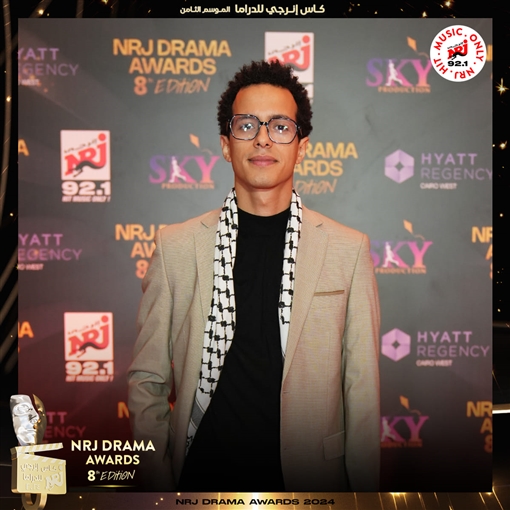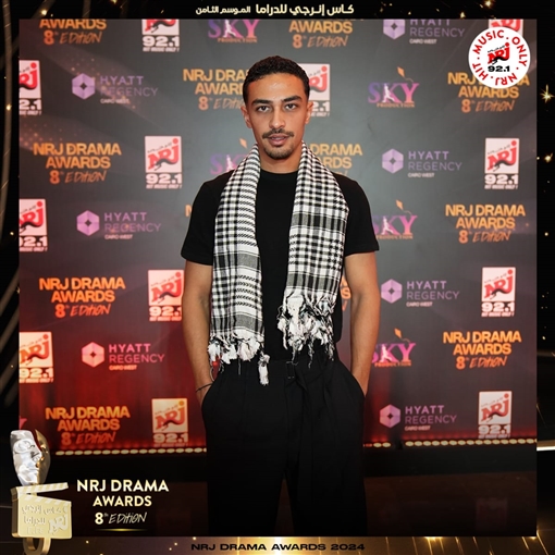 كما ظهر الفنان أحمد غزي يرتدي تي شيرت أسود وكوفية فلسطينية خلال حضوره حفل توزيع جوائز كأس إنرجي للدراما الموسم الثامن.