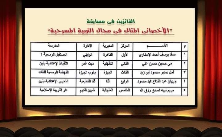 وأعلن البيان الصادر عن الإدارة العامة للأنشطة الثقافية والفنية والاجتماعية بوزارة التربية والتعليم اسماء اخصائي المسرح المثاليين وحصول الأستاذة جيهان على الترتيب الرابع في المسابقة التي مثلت فيها المديرية بناء على ترشيح صابر زيان مدير عام الشئون التنفيذية و نشأت احمد سيد الموجه العام للتربية المسرحية وتوجيه إدارة قنا التعليمية .