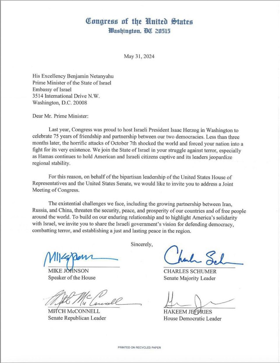 نتنياهو يطلب المثول أمام الكونجراس الأمريكي لتبرير حربه ضد غزة.. مستند