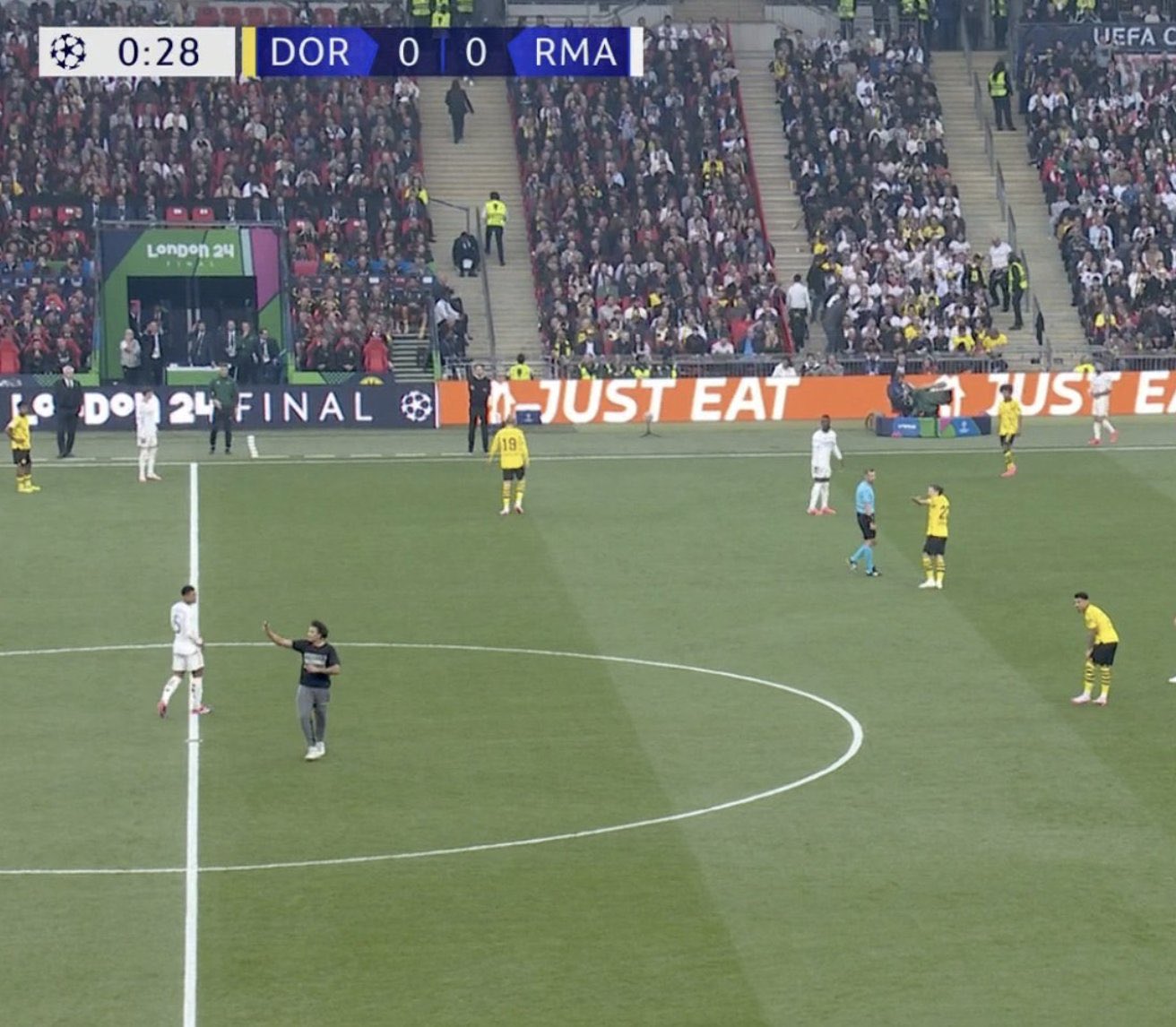 أقتحم احد المشجعين ملعب مباراة نهائي دوري أبطال أوروبا، بين ريال مدريد وبوروسيا دورتموند بعد لحظات من انطلاق اللقاء.