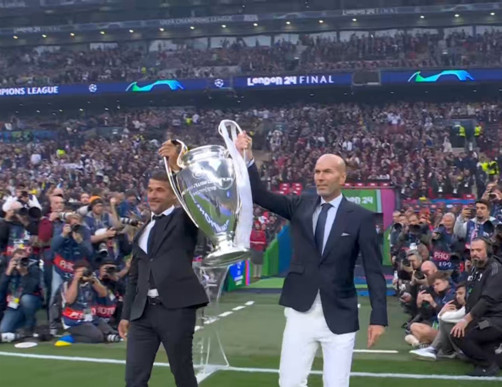 سلم الثنائي زين الدين زيدان مدرب ريال مدريد السابق، وكارل هاينتس ريدله نجم بوروسيا دورتموند وليفربول السابق كأس دوري أبطال أوروبا، قبل انطلاق المباراة النهائية.