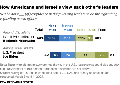 كشف معهد " بيو" لدراسات الرأى العام عن أحد الأسباب المهمة التى دفعت الرئيس الأمريكى جو بايدن إلى إعلان مقترحات إنهاء الحرب فى غزة منذ يومين، حيث سجلت استطلاعات الرأى العام هبوط شعبية القيادتين الأمريكية والإسرائيلية بين البالغين من شعبيهما نسبة 53% لبنيامين نتنياهو بين الأمريكيين كما هبطت مؤشرات ثقة الإسرائيليين فى جو بايدن بنسبة 42% للعام الحالى 2024، وهى نسب تتصاعد سلبيا تجاه كلا الرئيسان الأمريكى والإسرائيلى.