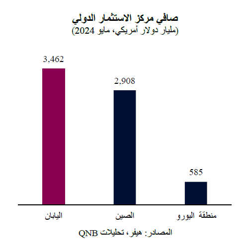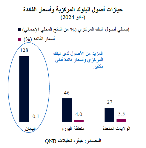 ويوضح تقرير QNB أن السياسة النقدية الميسرة للغاية تجعل بنك اليابان في وضع استثنائي من حيث إجمالي حيازات الأصول وتدني أسعار الفائدة اليابانية مقارنة بالاقتصادات المتقدمة الأخرى. ونتيجة لذلك، تعمل اليابان كمزود رئيسي لرأس المال والسيولة لبقية العالم. ويرجع ذلك إلى بحث المستثمرين اليابانيين عن عوائد أعلى في الخارج واستكشاف المشاركين في السوق لفرص "تجارة المناقلة" بناءً على أسعار الفائدة المنخفضة للين الياباني، أي الاقتراض بسعر منخفض في اليابان للاستثمار بسعر أعلى في ولايات قضائية أخرى، والمضاربة في فوارق أسعار الفائدة.