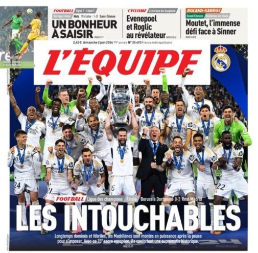 احتفلت الصحف العالمية بتتويج نادي ريال مدريد بلقب دوري الأبطال الأوروبية بعد تحقيق الفوز على نظيرهبروسيا دورتموند بهدف دون رد، ليحسم اللقب الـ 15 للملكي تاريخيًا.