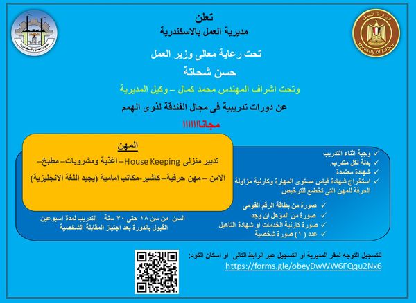 أعلنت مديرية العمل بمحافظة الإسكندرية، عن فتح باب التسجيل للحصول على الدورات التدريبية المجانية على مهن الفندقة، وذلك تفعيلاً لبروتوكول التعاون مع فندق هيلتون جرين بلازا ، وبدء التدريب المهنى للشباب ذوى الهمم من الجنسين علي تلك المهن.