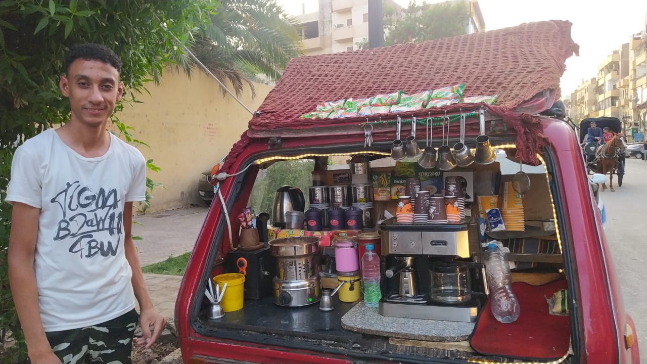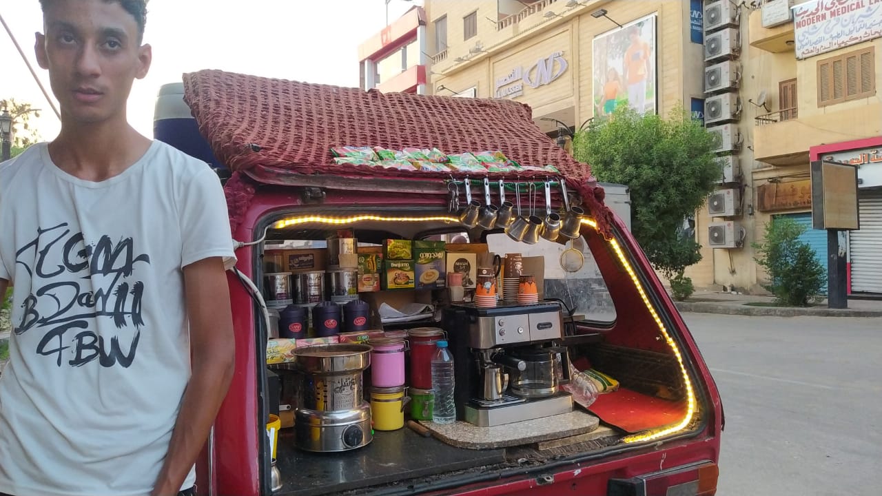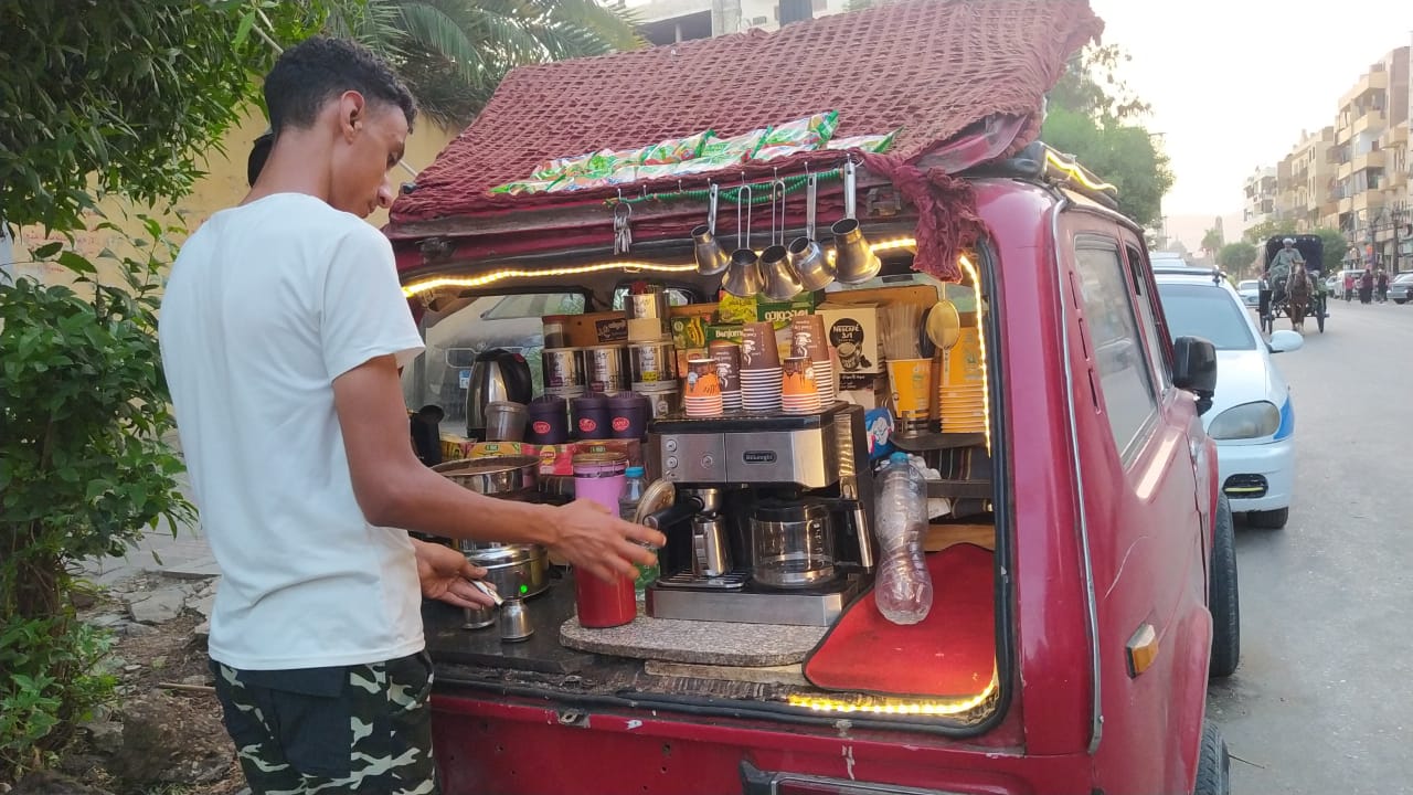 شاب لم يتعد عمره العشرين، يضرب نموذجًا يحتذى به في الكفاح، إذ يقف منتصبًا طوال تسع ساعات يوميًا، يعمل في همة وبحب، ينعكس هذا الإخلاص على مذاق القهوة التي يعدها داخل سيارة بشارع المحطة بوسط مدينة الأقصر، والتي باتت عشق للعابرين وكذلك العاملين بالمؤسسات المجاورة لذات الشارع.