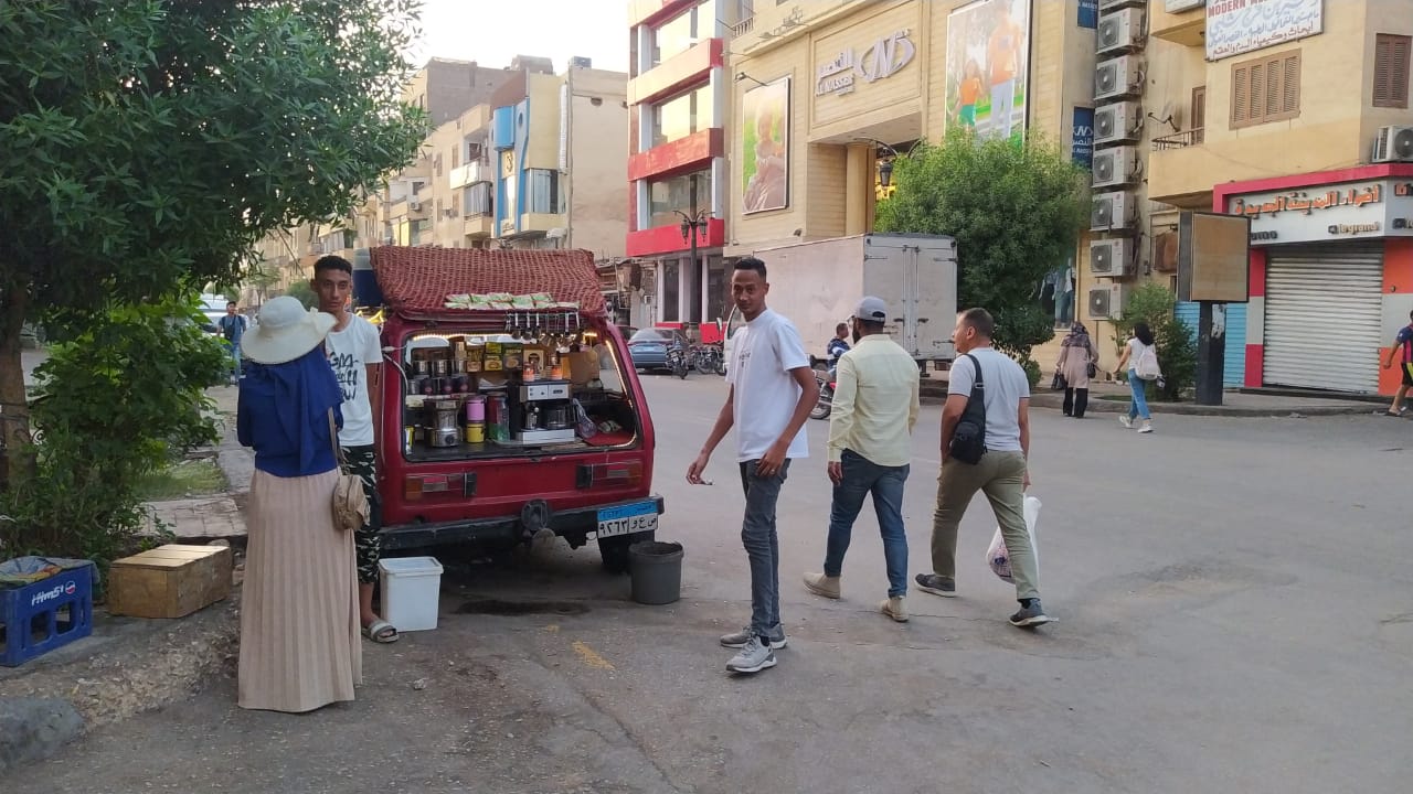 صوت القرآن يخرج من السيارة تستند بجوار شجرة خضراء بمنتصف شارع المحطة، وتزخرف الجزء الخلفي للسيارة أضواء ذات إضاءة خفيفة، يصنع الشاب لنفسه جوا هادئًا محاوط بالطمأنينة، وبجوار السيارة مقعدين لاستضافة الزبائن.