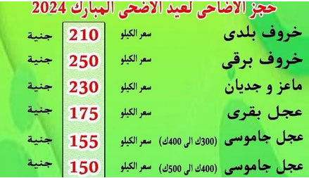 واوضح صالح في تصريحات للوفد أن الوزارة تمتلك العديد من مزارع الإنتاج الحيواني على مستوى الجمهورية، وبناءً عليه تم تحديد نقاط ارتكاز لخدمة المواطنين راغبي شراء الأضاحي بمختلف المحافظات، حيث يوجد أماكن في قرية "شندويل" بسوهاج، وقرية "مُشتهر" بالقليوبية، وجزيرة "الشعير" بالقناطر الخيرية، بخلاف وجود أكبر شادر في مزرعة "كفر غطاطي" بالجيزة، ويُقدر سعر الكيلو الواحد من لحم الخراف الحية قائم 210 جنيه، وسعر كيلو لحم الخروف البرقي قائم 250 جنيه، وسعر كيلو لحم الماعز والجديان القائم 230 جنيه، أما أسعار الجاموس القائم فتتراوح ما بين 150 لـ155 جنيه، وسعر كيلو اللحم البقري القائم بـ175 جنيه، كما يوجد أيضًا لحوم مذبوحة بسعر 250 جنيه للكيلو الواحد، وكفتة بـ240 جنيه، وكبدة بـ245 جنيه، وهذه المنافذ الثابتة تتواجد في مقرات "مديريات الزراعة والطب البيطري والإصلاح الزراعي وبعض مزارع قطاع الإنتاج والمحطات البحثية" على مستوى الجمهورية، هذا بخلاف المنافذ المتحركة والتي يُقدر عددها بـ33 منفذ متحرك يجوب المحافظات وتحديدًا بالمناطق ذات الكثافة السكانية المرتفعة بالتنسيق مع المحافظين.