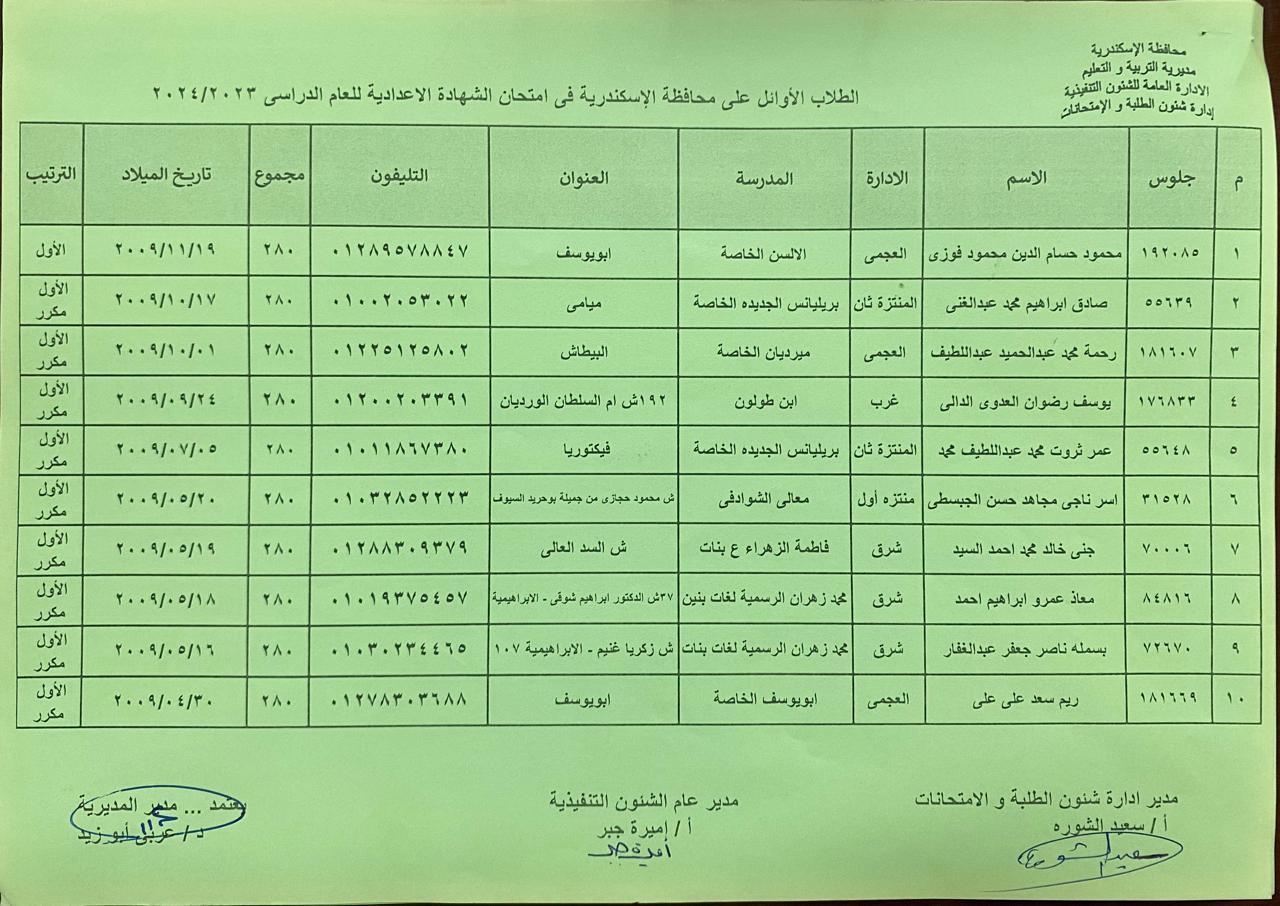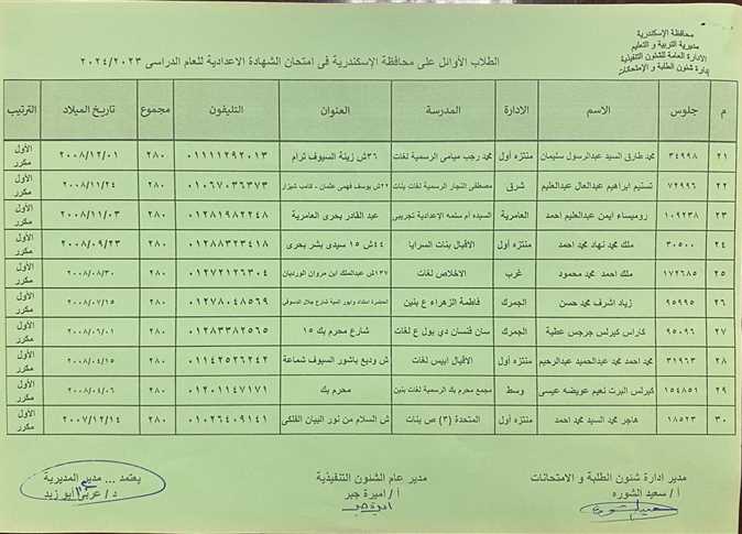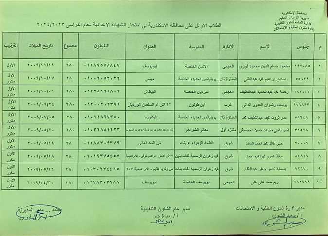 رصدت " الوفد " أسماء الأوائل بالشهادة الإعدادية على مستوى الإدارات التعليمية في الاسكندرية، للعام الدراسي 2023/ 2024