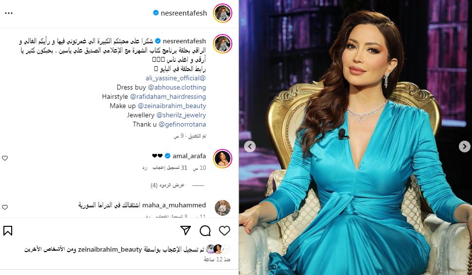 وعلقت على الصور، قائلة: “شكرا على محبتكم الكبيرة الي غمرتوني فيها و رأيكم الغالي و الراقي بحلقة برنامج كتاب الشهرة مع الإعلامي الصديق علي ياسين ، بحبكون كتير يا أرقى و اغلى ناس”.