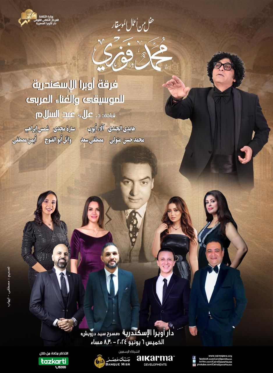 تقيم دار الأوبرا برئاسة الدكتورة لمياء زايد، حفلين لفرقة أوبرا الأسكندرية للموسيقى والغناء العربى بقيادة المايسترو الدكتور علاء عبد السلام يضمان نخبة من أعمال الموسيقار محمد فوزي