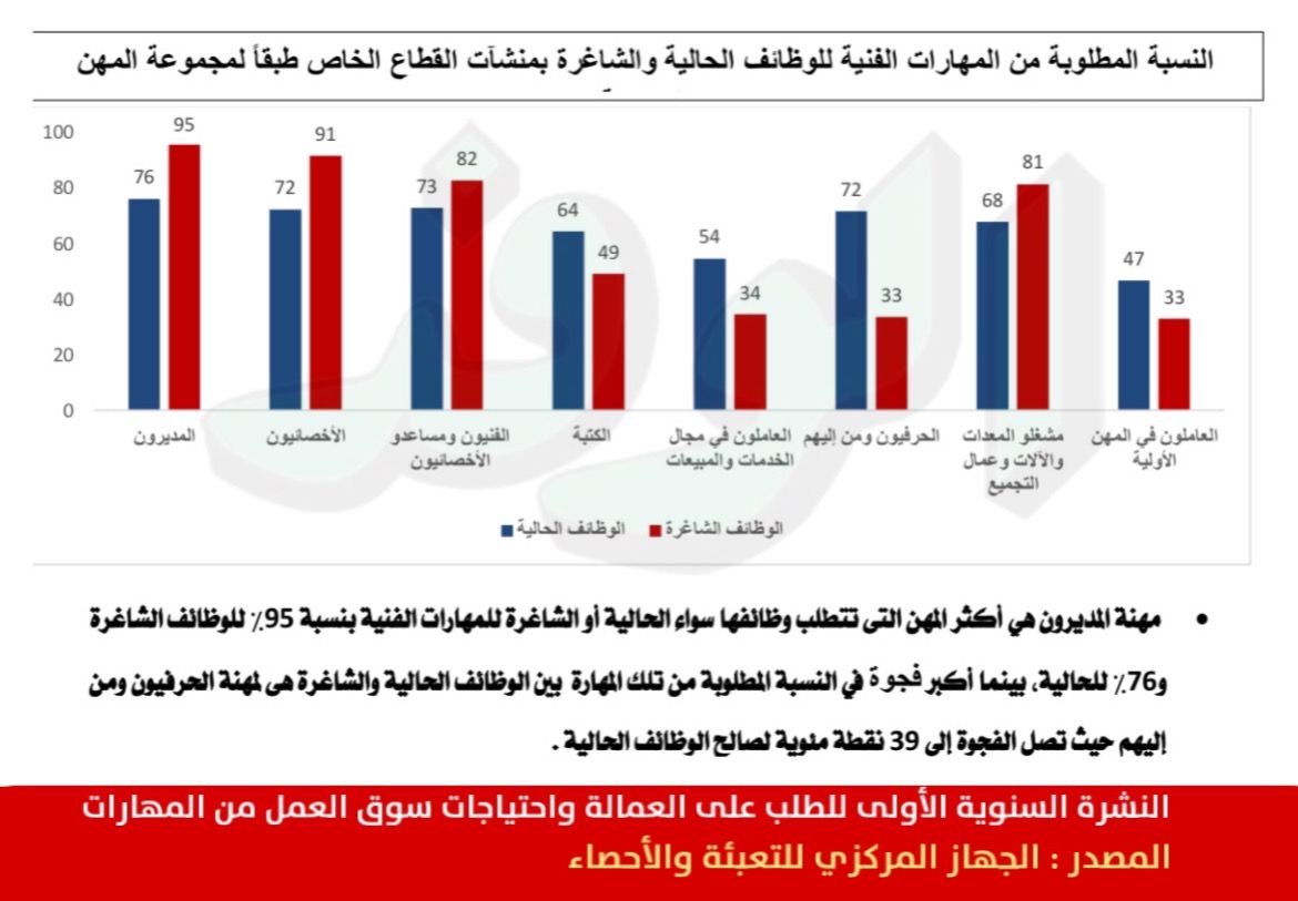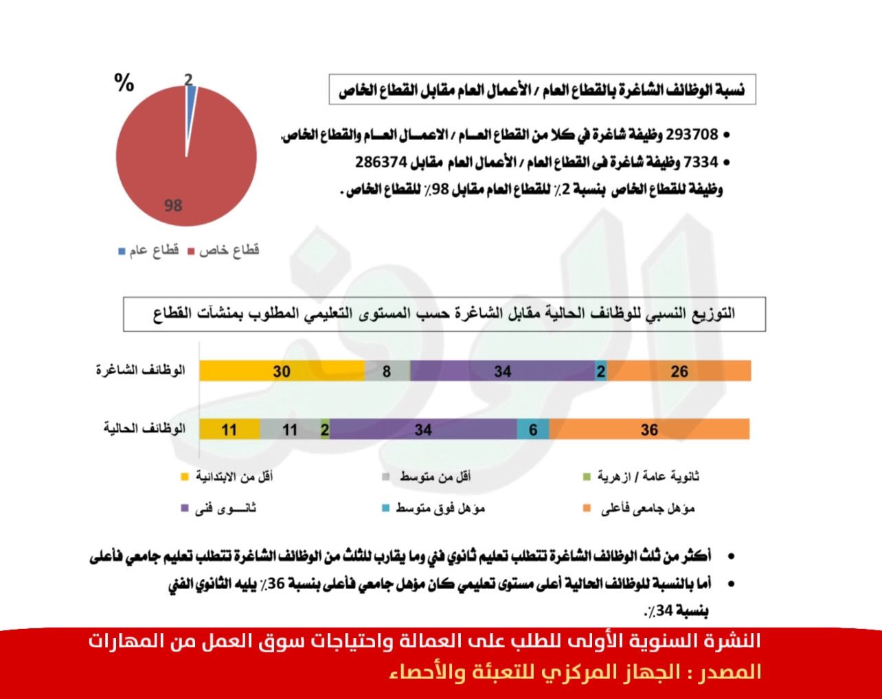 وأظهرت النتائج أن أكثر من ثلث الوظائف الشاغرة تتطلب تعليم ثانوي فني، بينما تتطلب ما يقارب الثلث تعليم جامعي أو أعلى. ويعكس ذلك أهمية الاستثمار في التعليم الفني والجامعي لتلبية احتياجات سوق العمل المتزايدة.