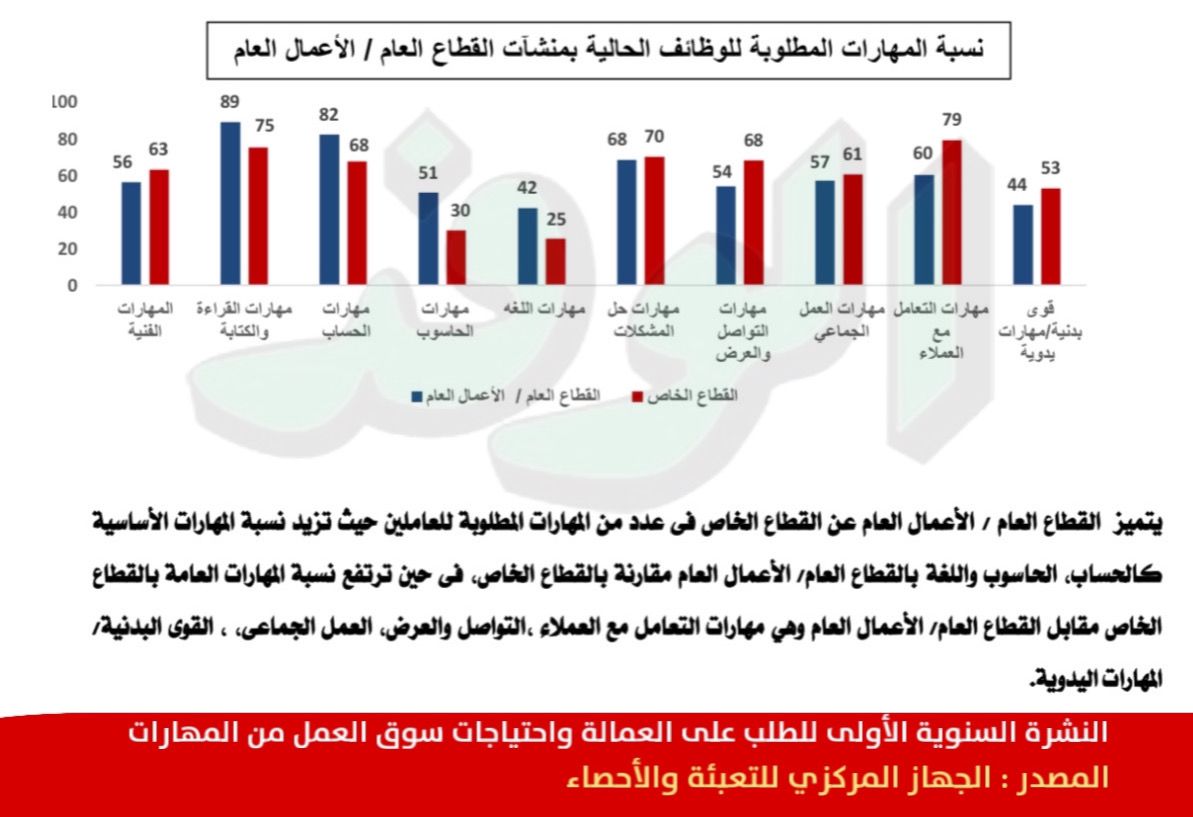 وتختلف مهارات العمل المطلوبة بين القطاعين العام والخاص. ففي القطاع العام، تزداد الحاجة إلى المهارات الأساسية مثل الحساب، الحاسوب واللغة، بينما تبرز مهارات التعامل مع العملاء، والتواصل والعرض، العمل الجماعي، والقوى البدنية/ المهارات اليدوية في القطاع الخاص.