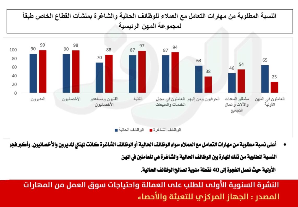 كذلك تُعدّ مهارات التعامل مع العملاء ضرورية في وظائف المديرين والأخصائيين، بينما تبرز فجوة كبيرة في احتياج هذه المهارة بين الوظائف الحالية والشاغرة في المهن الأولية (40 نقطة مئوية لصالح الوظائف الحالية).