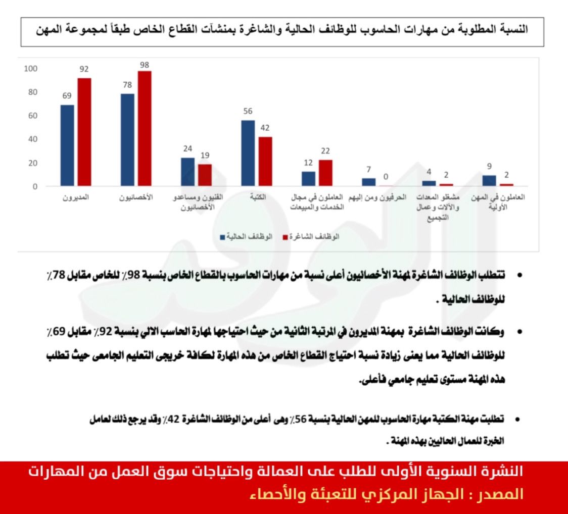 و تُعدّ مهارات الحاسوب ضرورية في مختلف الوظائف، خاصة في القطاع الخاص. وتتطلب وظائف الأخصائيين أعلى نسبة من مهارات الحاسوب (98%)، يليها المديرون (92%).