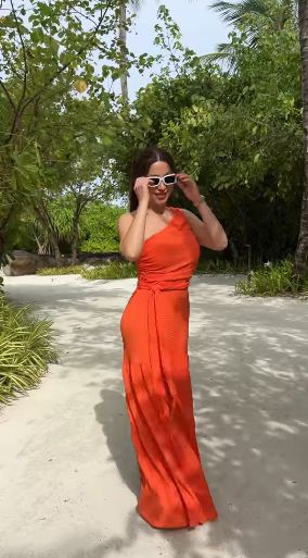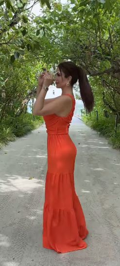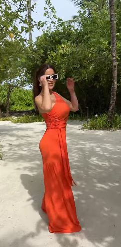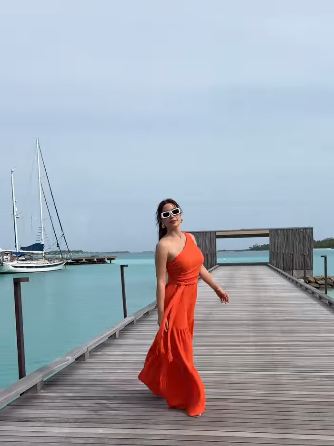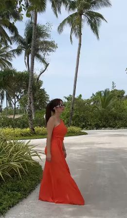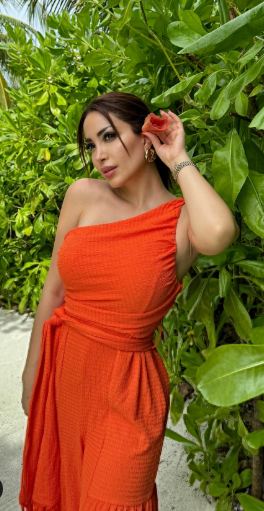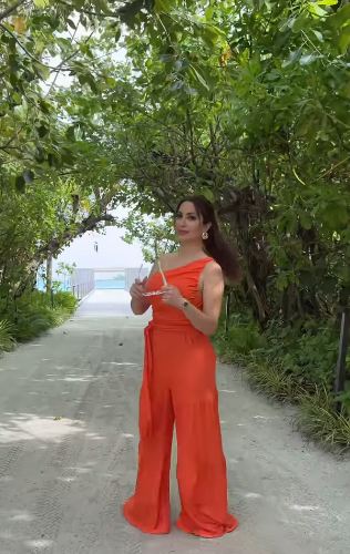 وبدت نسرين طافش بإطلالة صيفية جذابة، حيث ارتدت جمبسوت فضفاض، تنتمي لصيحة ألأوف شولدر، صمم من قماش ناعم باللون البرتقالي الصارخ، مما جعلها تشبه الفراشة وسط الطبيعة الخلابة.