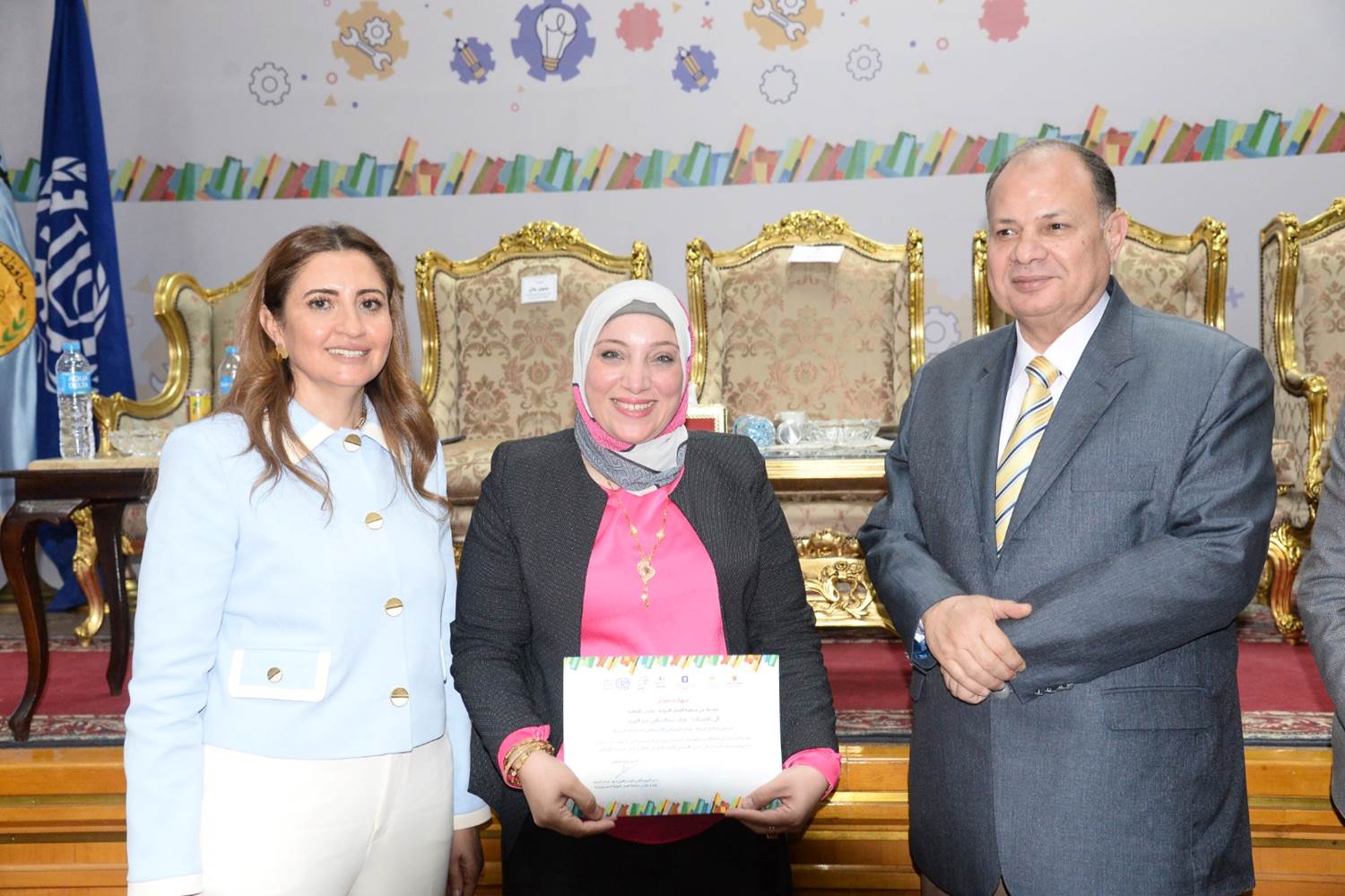 وفي نهاية اللقاء ؛ كرم المحافظ ؛ المدربين المشاركين لبرامج وأدوات منظمة العمل الدولية (المضي قدماً والتثقيف المالي ، وإبدأ وحسن مشروعك" ، ثم إلتقاط الصور التذكارية للمدربين وفريق العمل بمنظمة العمل الدولية ومسئولي مديرية التضامن الاجتماعي والجمعيات الأهلية الشريكة.