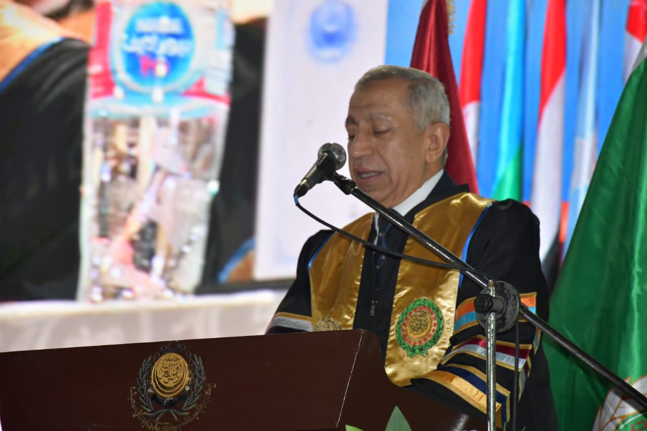واستهل رئيس الأكاديمية العربية للعلوم والتكنولوجيا والنقل البحري الدكتور/ إسماعيل عبد الغفار إسماعيل فرج ، كلمته بتهنئة الخريجين وذويهم وقال" نحتفل اليوم بكوكبة جديدة من خريجينا الذين اجتهدوا وحصلوا العلم فاستحقوا أن يسعدوا اليوم بجني ثمار جهدهم ".