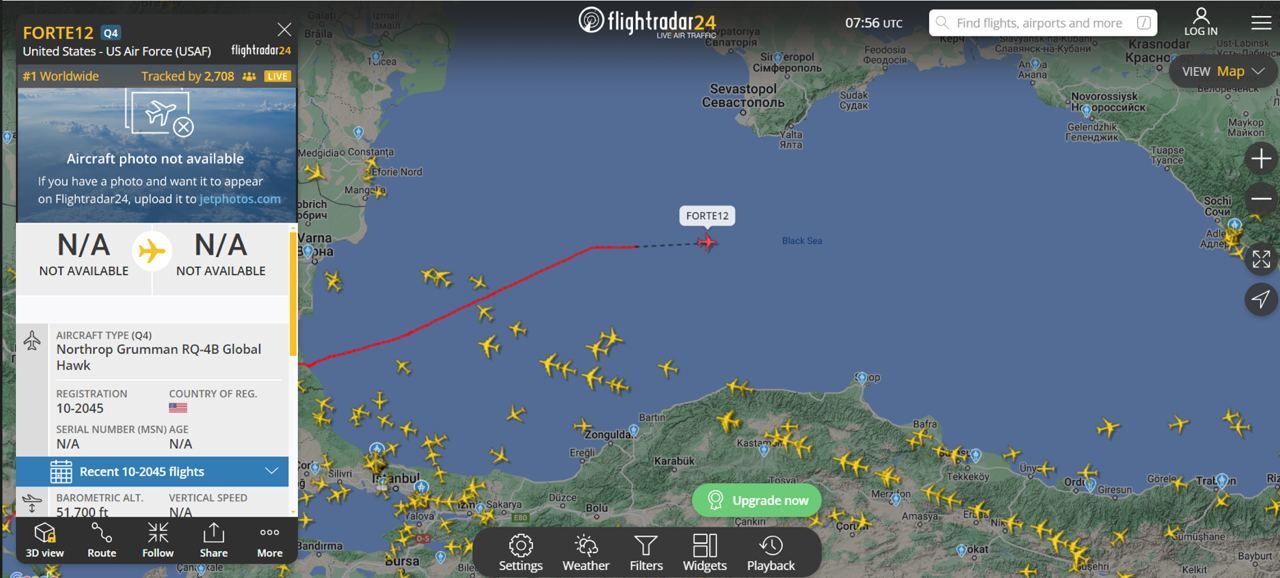 حلقت طائرة استطلاع أمريكية مسيرة من طراز Northrop Grumman RQ-4B Global Hawk أقلعت من قاعدة جوية في صقلية على ارتفاع 15.5 كيلومترا فوق المياه المحايدة للبحر الأسود بالقرب من القرم.