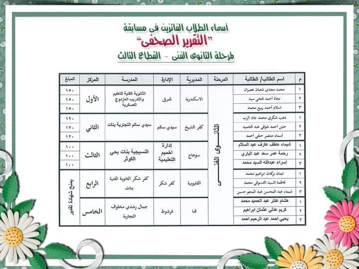 وأكد السيد، أن الوزارة أعلنت فوز مدرسة مدرسة جمال رشدى مخلوف الثانوية التجارية التابعة لادارة فرشوط التعليمية  بالمركز الخامس فى مسابقة التقرير الصحفى  التى ينظمها توجيه عام الصحافة بإشراف صابر زيان مدير عام الشئون التنفيذية ومحمود مرغنى موجه عام الصحافة والإعلام بالمديرية.