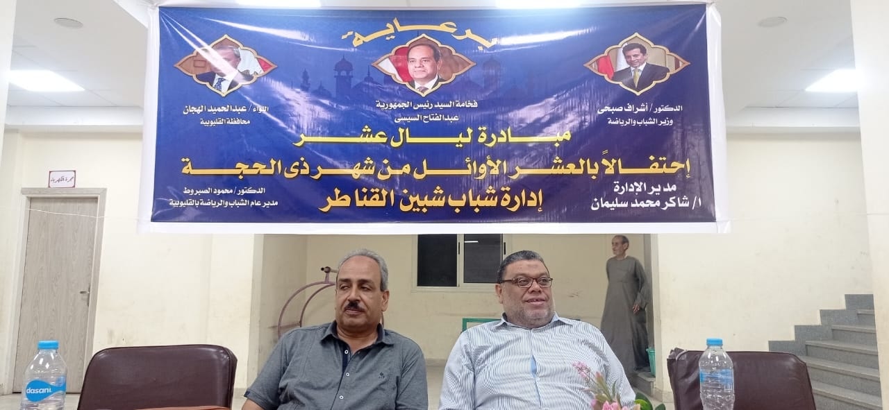نظمت إدارة شباب شبين القناطر مبادرة "ليال عشر" احتفالا بالعشر الأوائل من شهر ذى الحجة، بحضور شاكر محمد مدير إدارة شبين القناطر، وأعضاء مراكز شباب الإدارة، وذلك بعد تدشينها بمديرية الشباب والرياضة، تحت رعاية الدكتور أشرف صبحي وزير الشباب والرياضة، لنشر الوعى الدينى لدى الشباب والنشء.