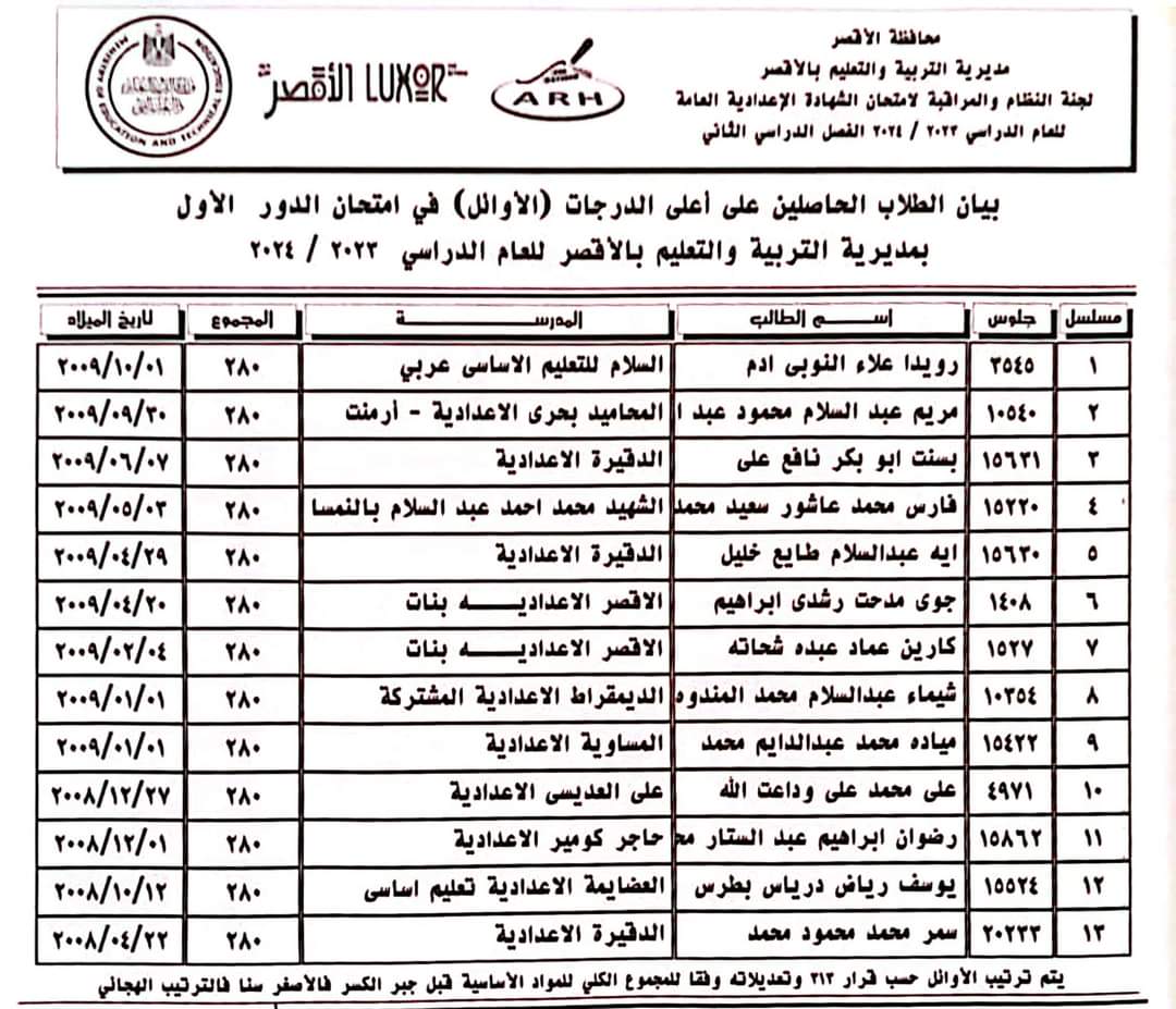 ننشر أسماء أوائل الشهادة الإعدادية بالأقصر 2024
