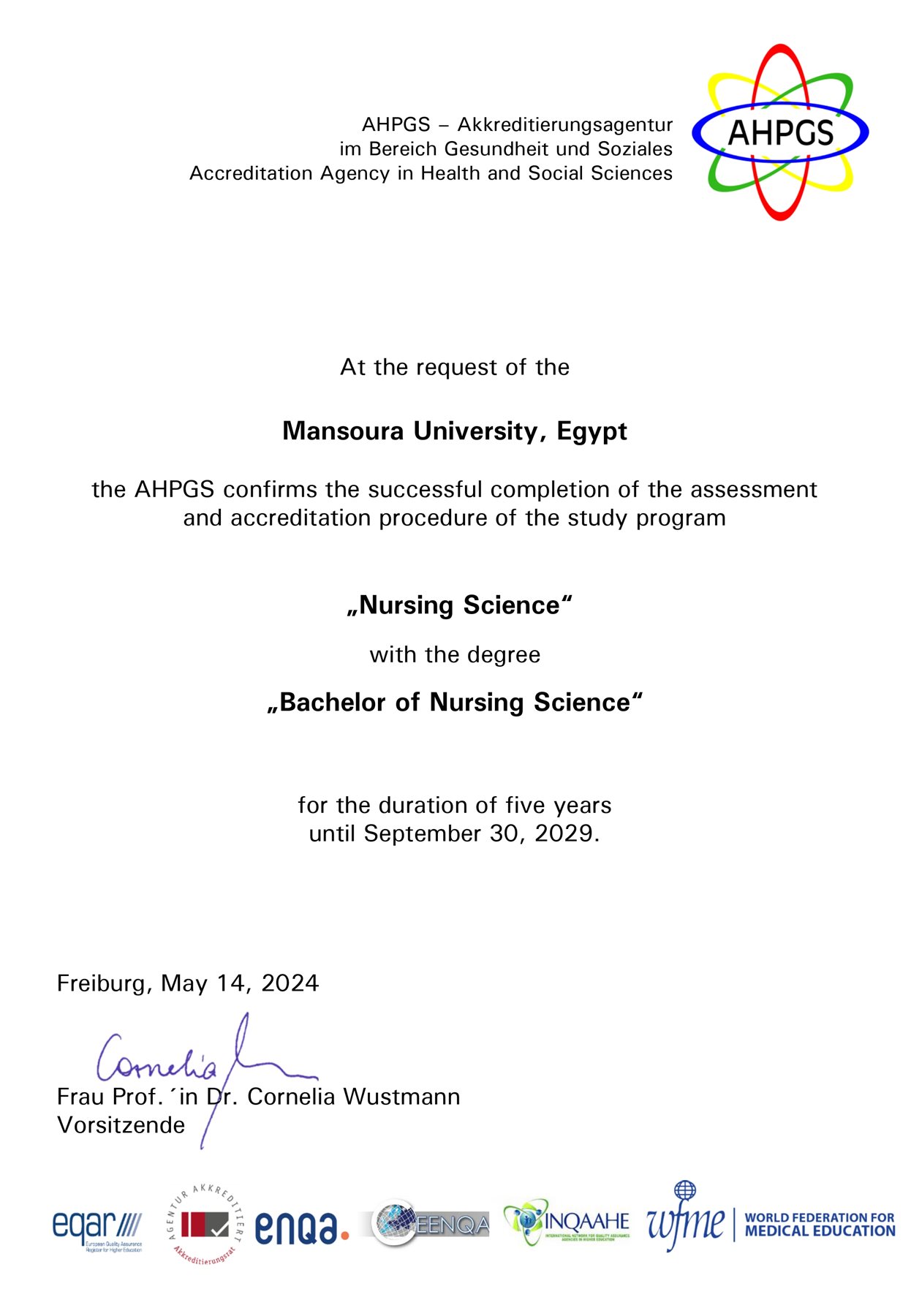 حصول كلية تمريض المنصورة على الإعتماد الدولي من هيئة AHPGS الألمانية