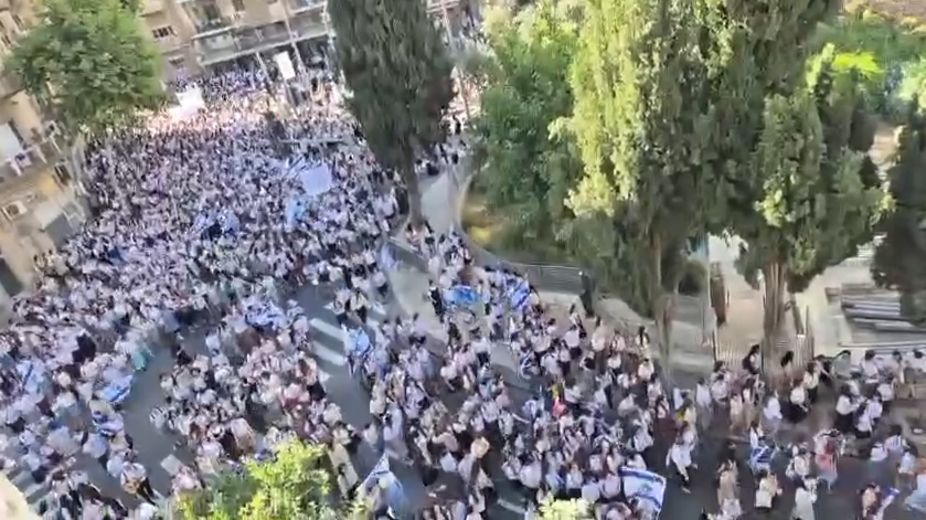 انطلقت "مسيرة الأعلام" بمشاركة مئات المستوطنين في ذكرى احتلال القدس، وسط عمليات استفزاز من مئات المستوطنين في باب العمود بالبلدة القديمة بالقدس.