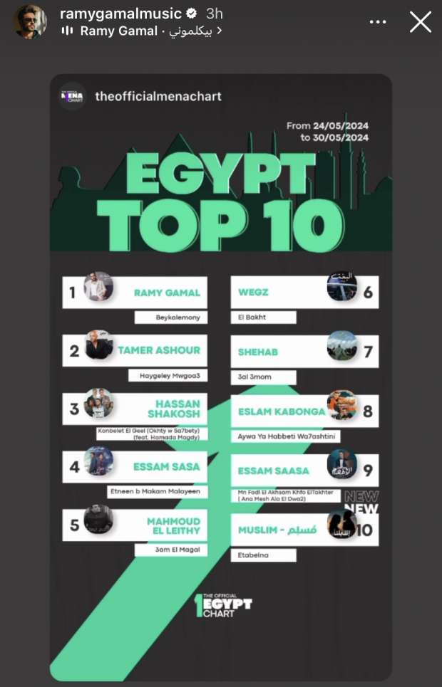 تصدر المطرب رامي جمال، قائمة الأغاني الأكثر في مصر لهذا الأسبوع، بأغنيته الجديدة بيكلموني من ألبوم خليني أشوفك.