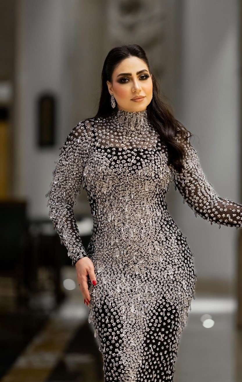وبدت بوسي بإطلالة ساحرة مختلفة ولكنها مواكبة لاحدث صيحات الموضة، حيث ارتدت فستان طويل مجسم، بأكمام طويلة، تميز بلياقة عالية، صمم من قماش المخمل المطرز بالكامل بحبات النجف، لتبدو مثل القمر مما عكس قوامها الرشيق وانوثتها الطاغية بشكل لافت.