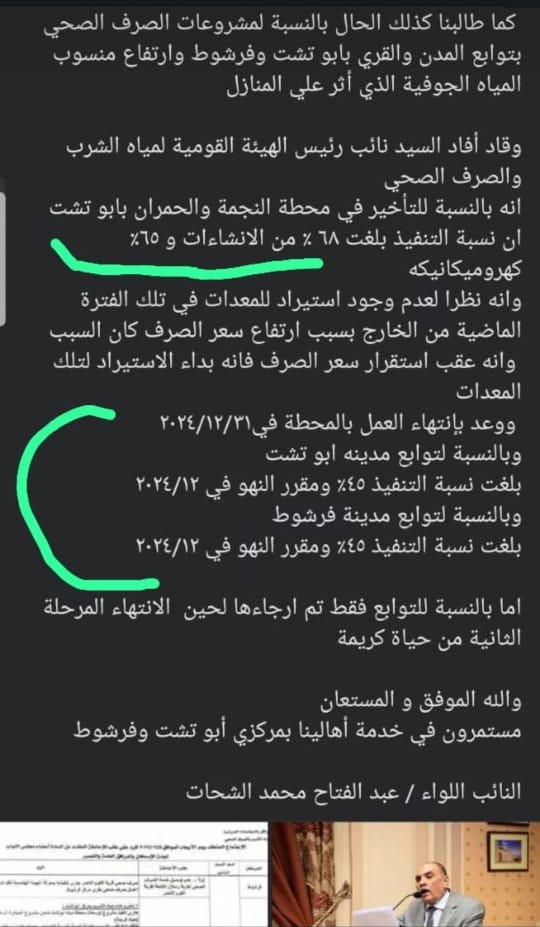 تتمثل خطة "حياة كريمة " فى بناء وإنجاز 55 محطة صرف صحى بمعدل 2 فى أنحاء 33 قرية على مستوى مركز أبوتشت، تبلغ تكلفة المحطة الواحدة حوالى 150 مليون جنيه قبل زيادة الأسعار تم إنجاز 60% من حجم الخطة ويتبقى جزء سيتم إستكماله فى المرحلة الثانية من مشروع حياة كريمة، حيث ينتظر الجميع إقرار المخصصات والميزانية للسنة المالية الجديدة 2024/2025 فى يوليو القادم، ويواجه مشروع محطات الصرف الصحى ضغوطا متنوعة على رأسها الإمتدادات العشوائية وخصوصا فى قرى خط الجبل التى تحولت فيها المنازل والمزارع الى واقع، كوّن نجوع وتوابع للقرى الرئيسية يستحيل فى بعض الأحيان أن يمتد لـ 2 او 3 كيلومتر من أجل مجموعة بيوت بالإضافة الى مراعاة ما إذا كانت الأراضى المقام عليها المنازل وضع يد او غير مقننة أو ما زالت ملكا للدولة، مع ضرورة الحصول على موافقات كتابية من المجالس المحلية بناء على لجان ومعاينات ودراسات هيدرولوكية سواء لمد المياه العذبة ورفعها أو لمد الصرف الصحى هذه البيوت والمزارع، مما يزيزد من حجم أعباء الهيئة العامة لمياه الشرب والصرف الصحى التى توكِل هذه الأعمال الى مقاولين وشركات خاصة.