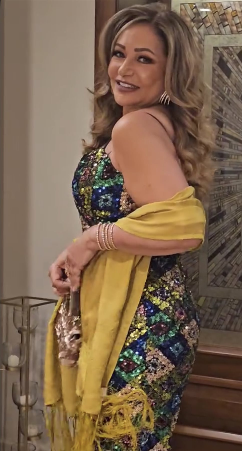ولفتت ليلى علوي الأنظار بجمبسوت مثير مصنوع من الترتر اللامع متعدد الألوان، ومكشوف الصدر والظهر، ووضعت على كتفيها شال باللون الأصفر؛ ليتماشى مع لون الجمبسوت.