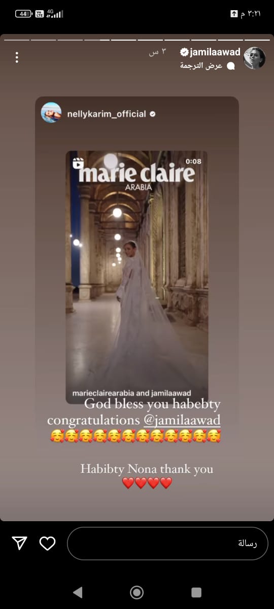وأعادت جميلة، تهنئة الفنانة نيللي كريم لها، عبر خاصية "الاستوري"، وعلقت عليها قائلة: "حبيبتي نونا.. شكرًا".