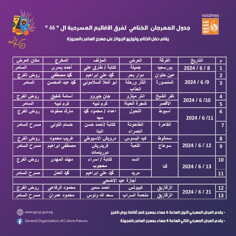 برنامج وتفاصيل الدورة 46 من المهرجان الختامي لفرق الأقاليم المسرحية