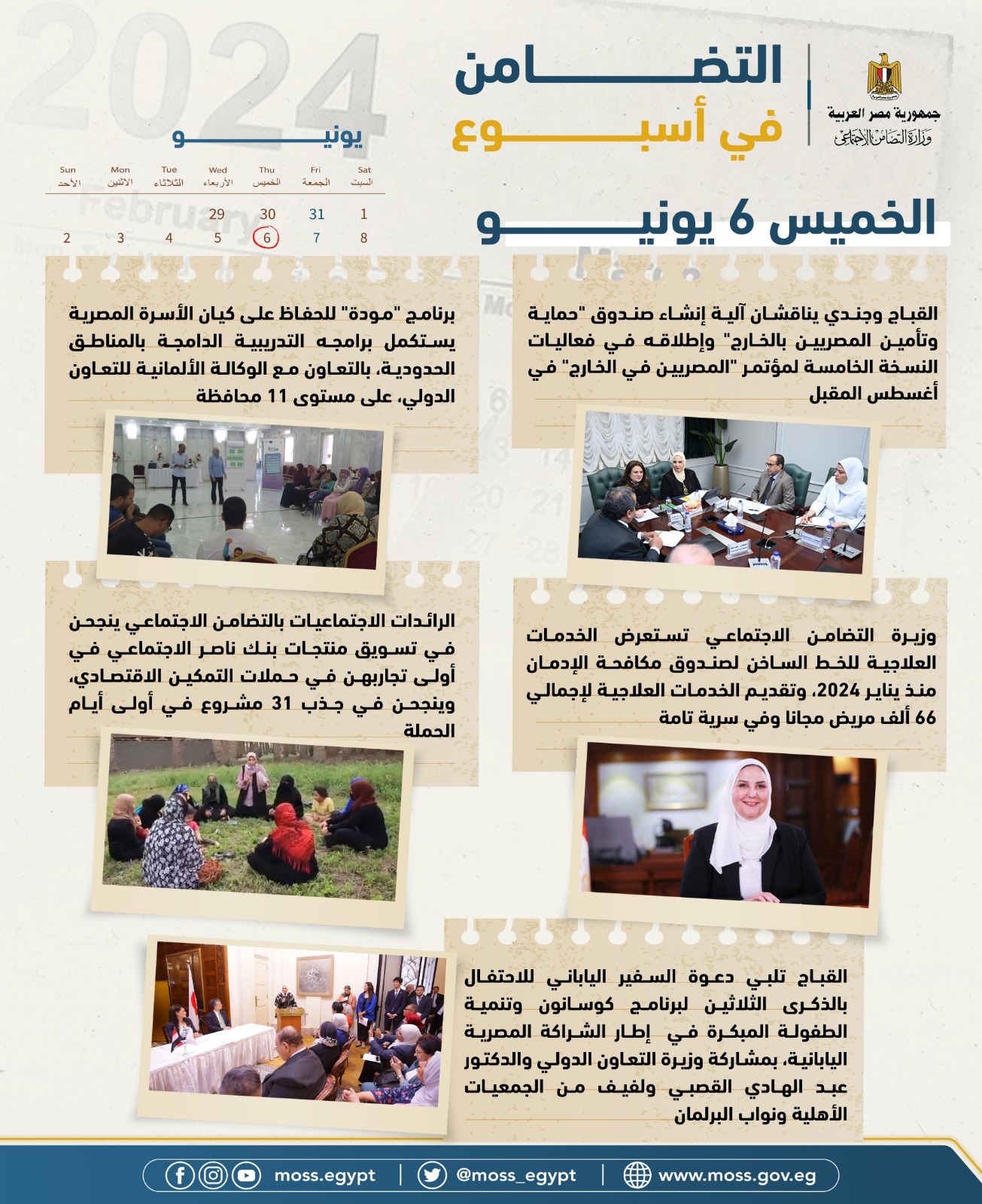 أصدرت وزارة التضامن الاجتماعي تقريرها الأسبوعي بالإنفوجراف والفيديو، حيث تستعرض من خلاله الأنشطة والأحداث، التي قامت بها السيدة نيفين القباج وزيرة التضامن الاجتماعي، وكذلك قطاعات الوزارة المختلفة خلال الفترة من  من 1  يونيو إلى 6 يونيو 2024، ونستعرض أبرزها في التقرير التالي: