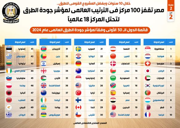 بالإنفوجراف... مصر تقفز 100 مركز في الترتيب العالمي لمؤشر جودة الطرق لتحتل المركز 18 عالميًا