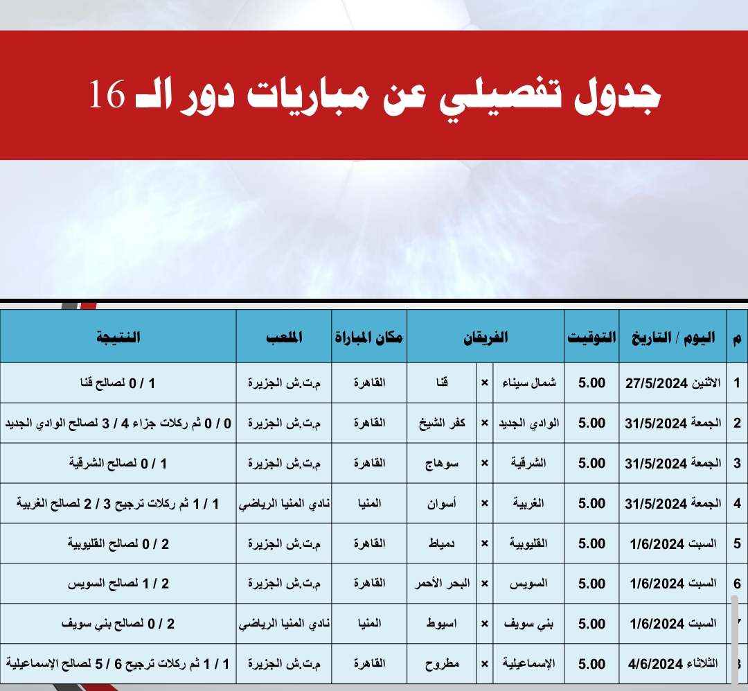 وبحسب الجدول المعلن، أسفرت مواجهات دور ١٦ من دوري مراكز الشباب عن: الوادي الجديد مع الغربية، القليوبية مع السويس، قنا مع بني سويف، والشرقية مع الإسماعيلية.