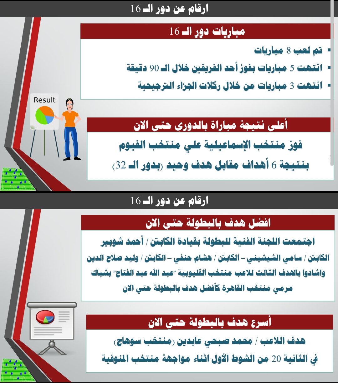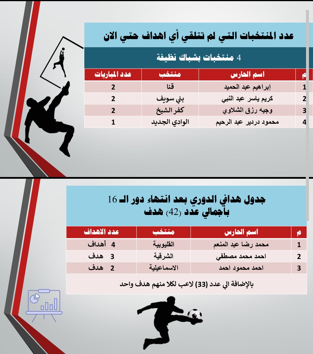 وحققت (٤) منتخبات شباك نظيفة خلال مبارياتهم وهم: قنا، بني سويف، كفر الشيخ، والوادي الجديد مسجلة (٤٢) هدف منهم (٢٩) في دور ٣٢ و(١٣) هدف في دور ١٦، وجاء فوز منتخب الإسماعيلية علي منتخب الفيوم بسداسية مقابل هدف واحد كأعلى نتيجة.