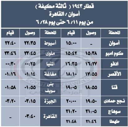 - قطار 1943( ثالثة مكيفة ) أسوان / القاهرة يعمل في الفترة من 11 / 6 / 2024 حتي 28 / 6 / 2024 حيث يقوم الساعة 03:00 مساء من محطة أسوان يصل محطة القاهرة الساعة 03:40 صباحاً طبقاً للجدول المرفق.