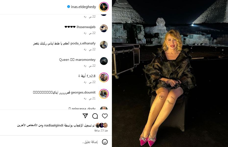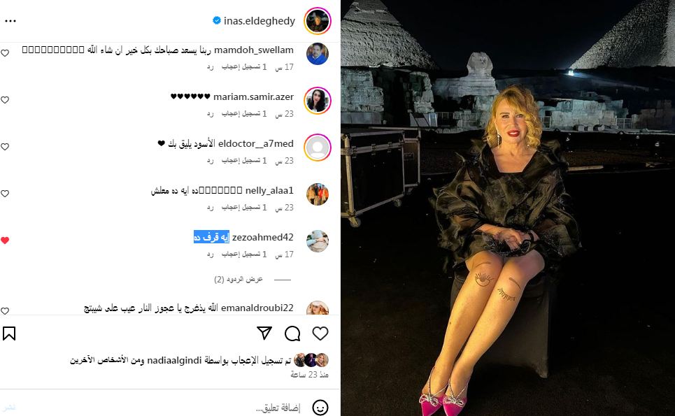 وانهالت تعليقات متابعيها على إطلالتها وجاءت أبرزها معارضه لها: "الحقي يا طنط ايناس ركبتك بتغمز، إيه قرف ده، روتين ركبك يا فنانه بسرعه، أستاذة إيناس فيه كذا علامة للماسونية ياولية".