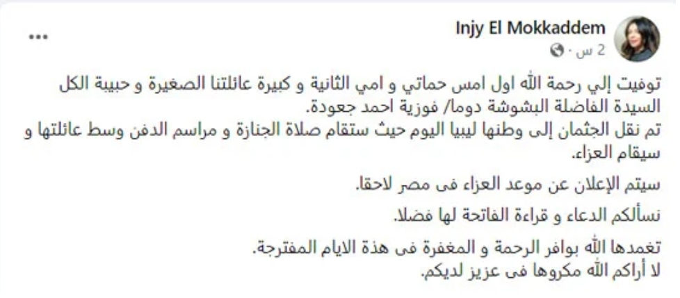 وكتبت إنجي المقدم، عبر صفحتها قائلة : "توفيت أول أمس حماتي وأمي الثانية وكبيرة عائلتنا الصغيرة وحبيبة الكل السيدة الفاضلة البشوشة دوما فوزية أحمد جعودة.. تم نقل الجثمان إلى وطنها ليبيا اليوم حيث ستقام مراسم الدفن وسط عائلتها وسيقام العزاء.