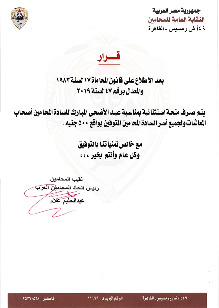 يتم صرف منحة استثنائية بمناسبة عيد الأضحى المبارك للسادة المحامين أصحاب المعاشات ولجميع أسر السادة المحامين المتوفين بواقع 500 جنيه.